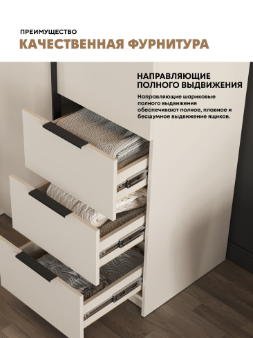 • Вместительные ящики: Внутренние габариты каждого ящика (Д.363 х В.106 х Г.418 мм) позволяют хранить белье, аксессуары и другие мелочи. Дно ящиков выполнено из прочного ХДФ.
