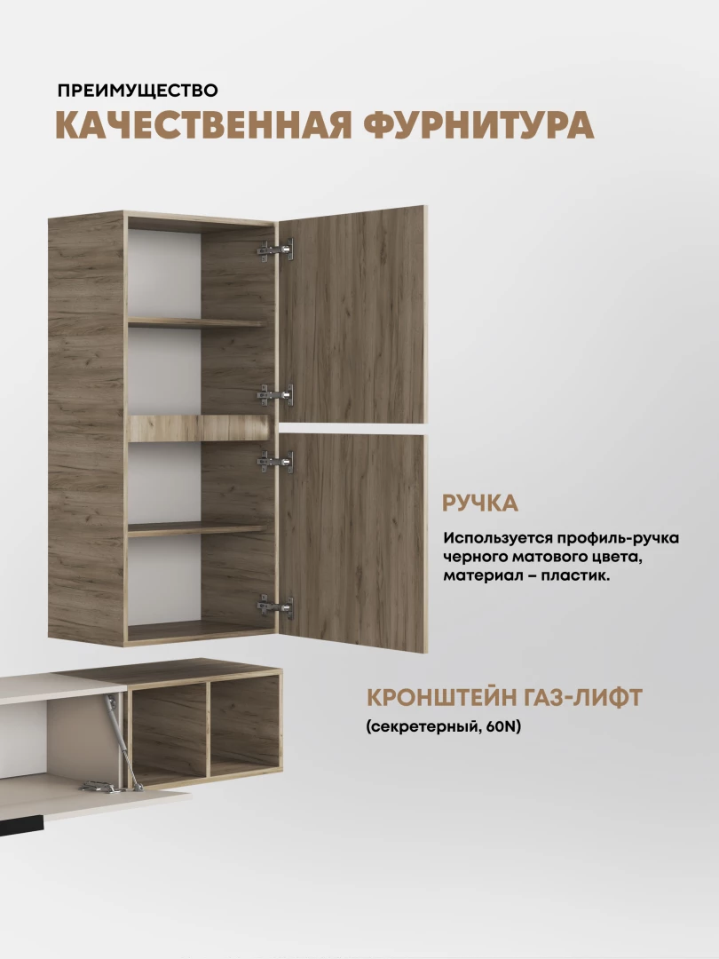 Гостиная Бохо расширит систему хранения, позволив разместить телевизор, личные вещи и украсить комнату аксессуарами. Комбинированное наполнение включает эстетичные навесные элементы, которые помогут оптимально использовать пространство. Характеристики: • Материал: ЛДСП 16 мм. • Механизм открывания: распашной, откидной. • Ориентация сборки: универсальная. • Максимальная нагрузка на тумбу: 30 кг. • Максимальная нагрузка на полку: 5 кг. Габаритный размер (ШхВхГ): 1800х1600х350 мм.