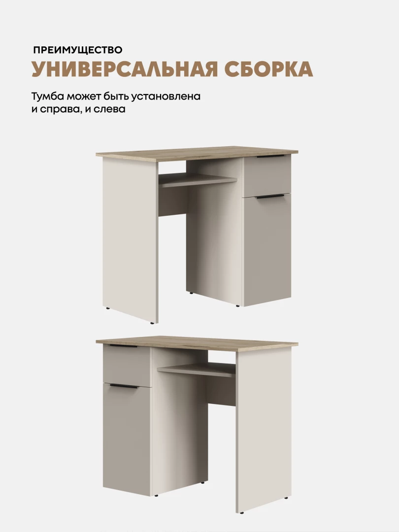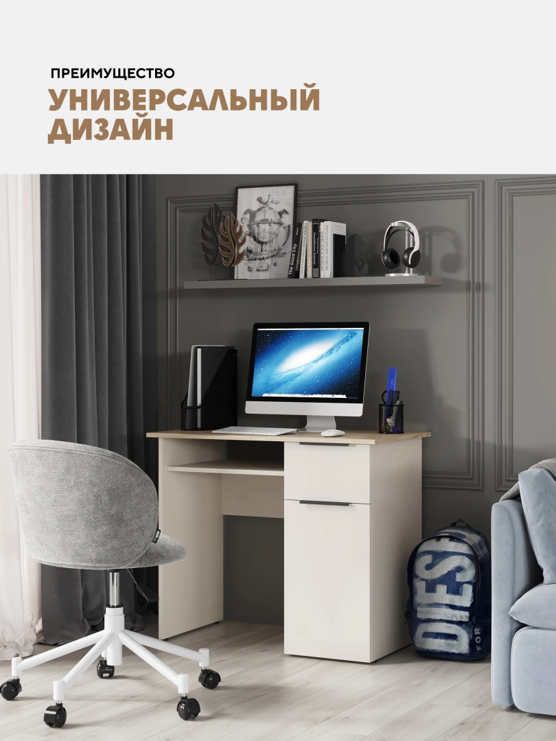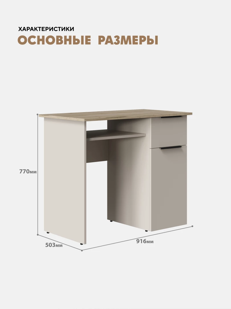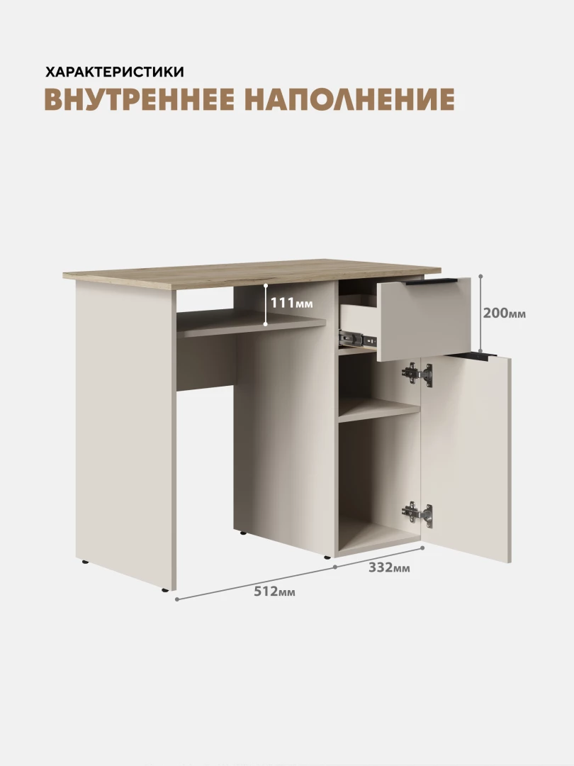 Просторная столешница (512 × 470 мм) и полка над рабочем местом (глубина 415 мм) для организации рабочего пространства.