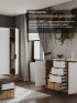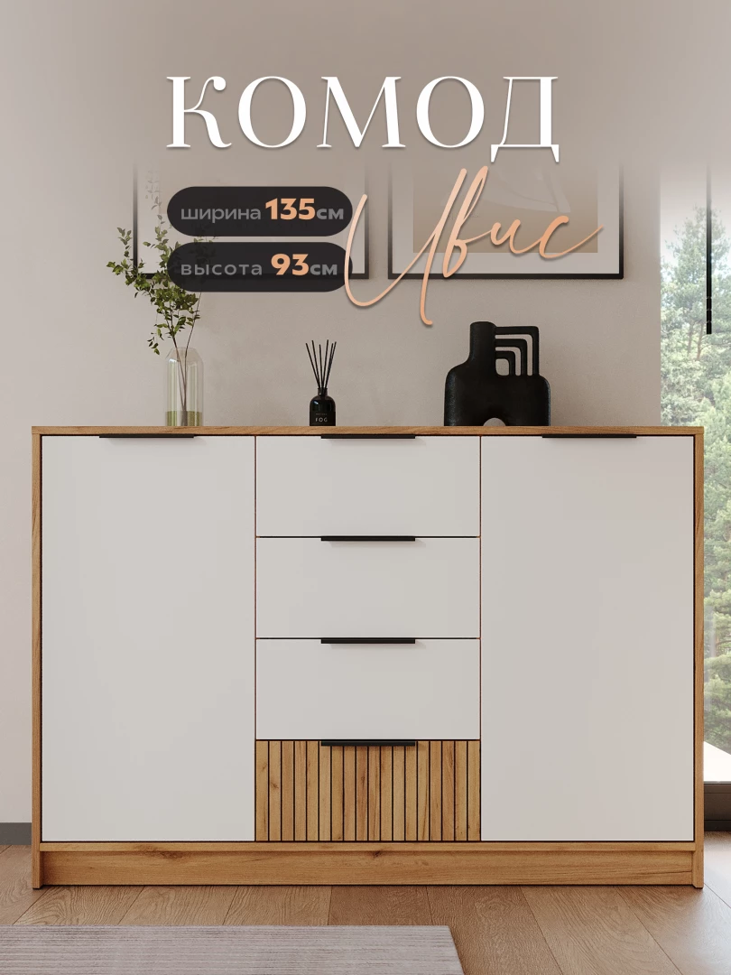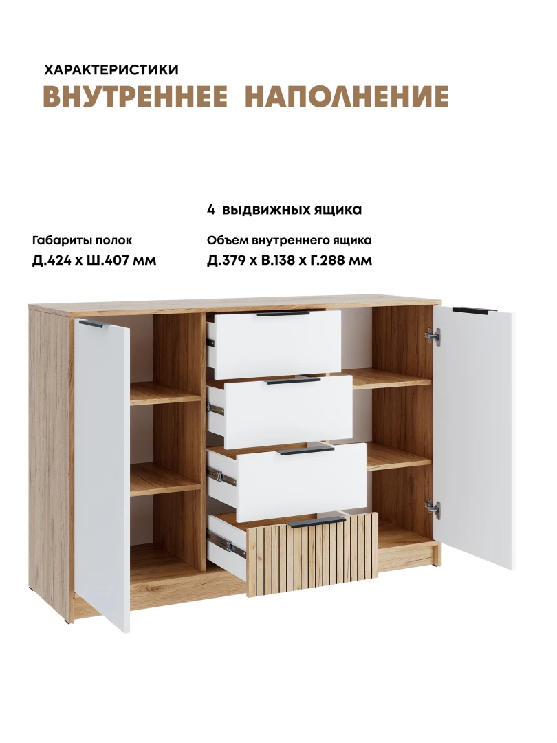 Этот комод сочетает в себе просторные ящики для мелких вещей и удобные открытые полки за створками.