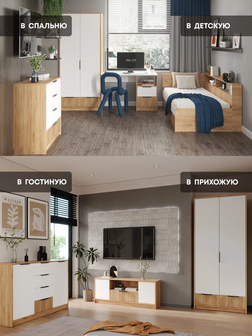 3 удобные зоны хранения: антресоль, основной отдел с полками и штангой, и комод с ящиками.