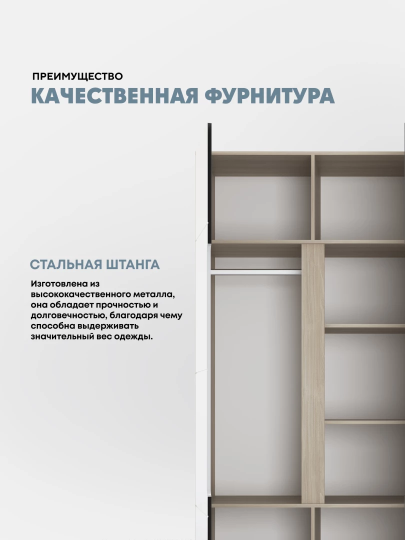 Хромированная штанга фиксируется внутри шкафа при помощи фланцев и выдерживает значительный вес, выполняя функции хранения одежды. При небольшой глубине шкафа (до 55 см.) наиболее удобна выдвижная штанга (микролифт).