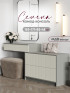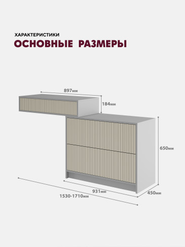 Длина всего изделия может варьироваться в зависимости от взаимного расположения Консоли и Комода. РЕКОМЕНДУЕМАЯ УСТАНОВОЧНАЯ ДЛИНА: от 1530мм (MIN), с учётом использования консоли в качестве туалетного столика (и эргономики размещения сидения возле него). до 1710мм (MAX), с учётом минимальных расстояний от краёв деталей корпусов комода и консоли для стягивания двух блоков межсекционными стяжками.