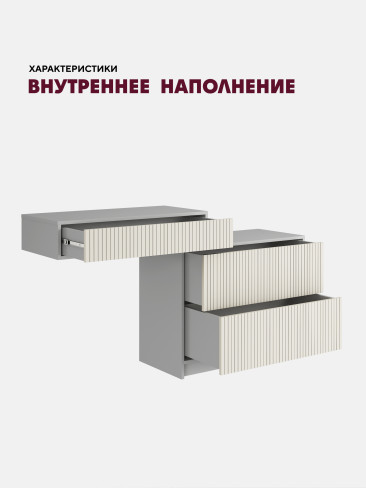 • Консоль представляет собой подвесную тумбу (высота 184мм, ширина 897мм) с одним ящиком без ручки, на направляющих полного выдвижения (400мм). Открывание рукой за фасад, для этого в нижней части ящика предусмотрен зазор между корпусом и фасадом. Ящик имеет внутреннюю перегородку, разделяющую ящик на два равных отсека. Отсеки имеют следующие внутренние габариты: Д.395 х В.106 х Г.384мм, полезная высота ящика 137мм.