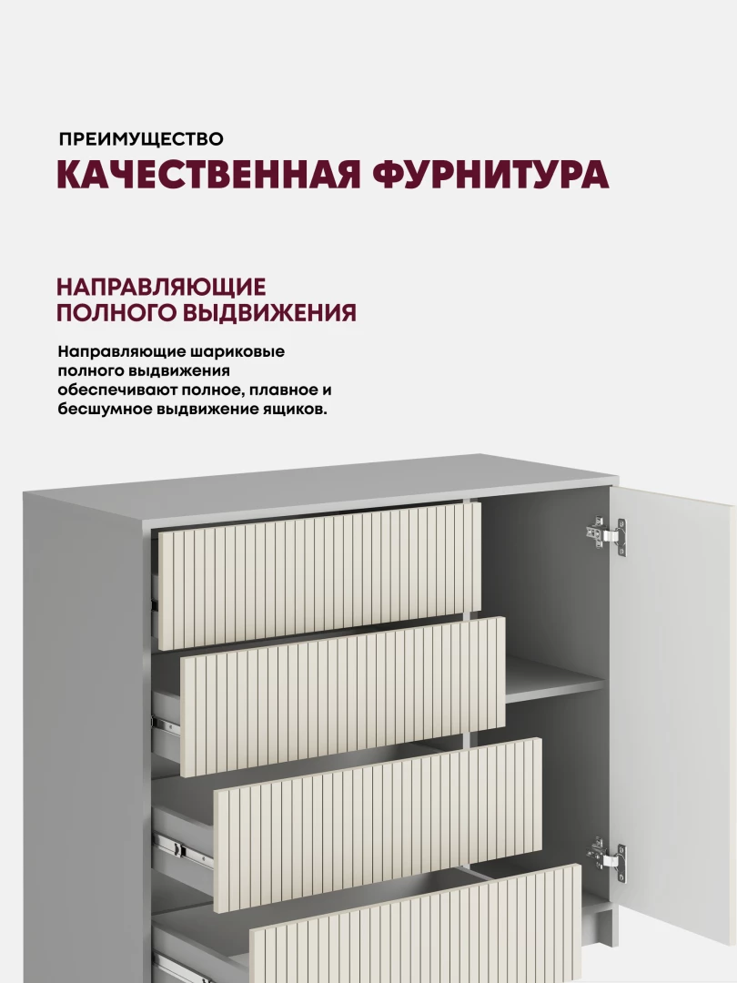 Вместительный комод со створкой и с четырьмя ящиками без ручек, на направляющих скрытого монтажа (400мм) с функцией Push-To-Open (открывание-закрывание от нажатия на фасад). Дно ящиков – ЛДСП 16мм.