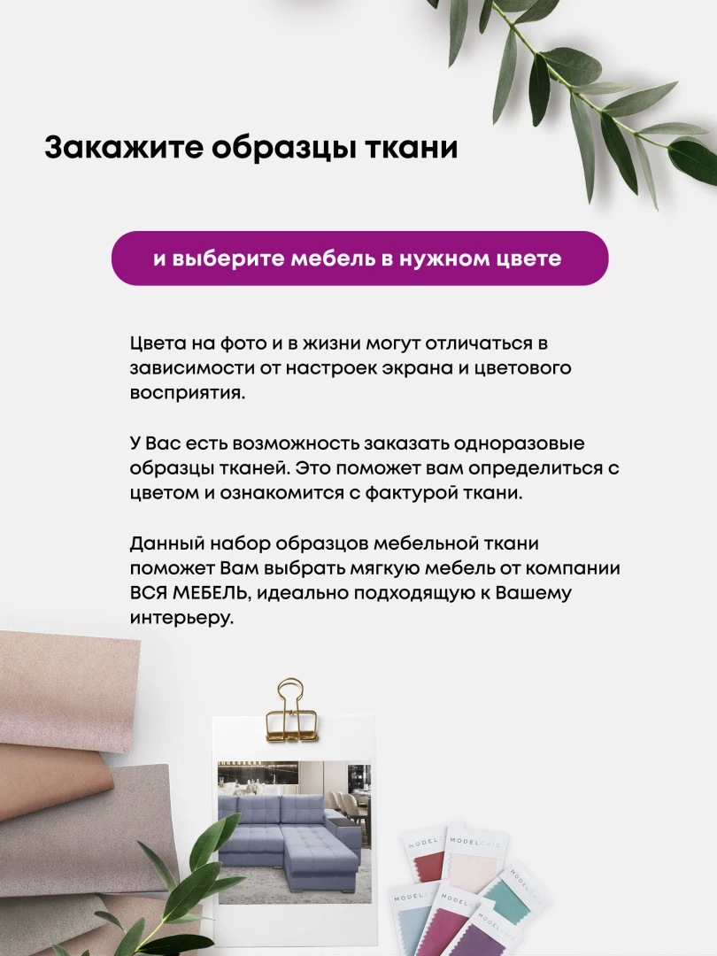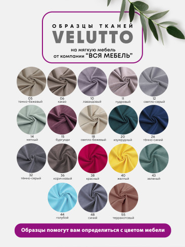 Велюр «Velutto» – материал с густым невысоким ворсом и бархатистой текстурой. Обладает массой достоинств: хорошо противостоит механическим воздействиям, не выгорает на солнце, идеально держит форму, не растягиваясь со временем. Палитра представлена мягкими светлыми и темными оттенками. Мягкая мебель в велюровом текстиле выглядит оригинально и презентабельно.