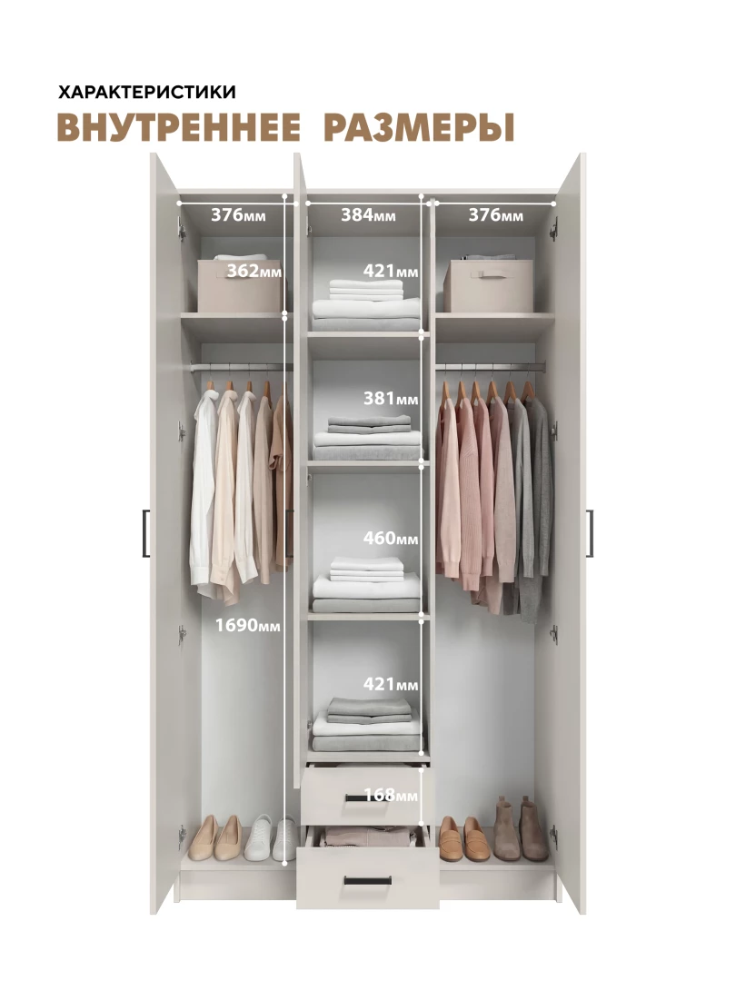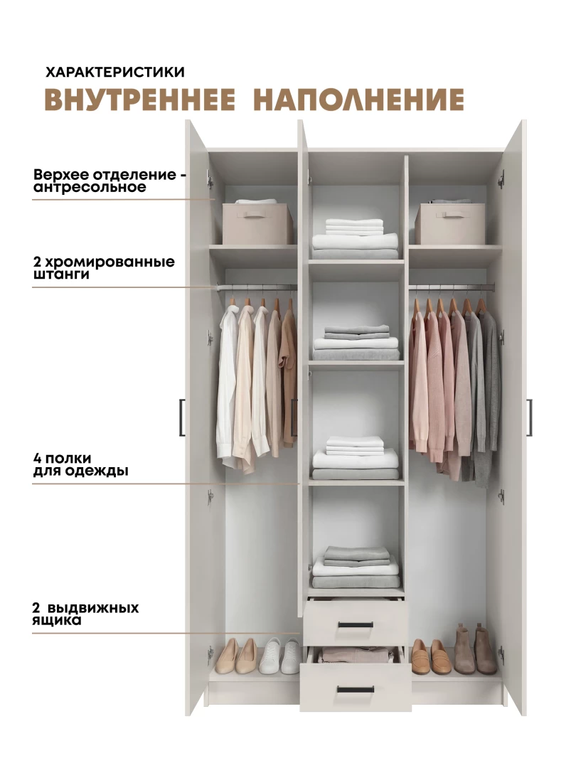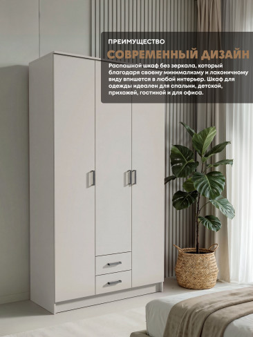 Шкаф для одежды — стиль и порядок в вашем доме! Функциональный и вместительный шкаф для одежды распашной станет отличным решением для хранения вещей в спальне, прихожей или гардеробной. Этот распашной шкаф с тремя дверцами сочетает в себе удобство, современный дизайн и практичность. Трехстворчатый платяной шкаф оснащён продуманной системой хранения: внутри расположена штанга для одежды на вешалках и вместительные полки для сложенных вещей, обуви и аксессуаров. Такой шкаф для вещей помогает поддерживать порядок и экономить пространство. Корпус выполнен из качественных материалов ЛДСП, что обеспечивает долговечность и устойчивость к износу. Лаконичный внешний вид делает этот гардеробный шкаф универсальным — он гармонично впишется в любой интерьер: от классики до современного стиля. Этот вместительный шкаф идеально подойдёт для небольших помещений. Это отличный выбор, если вам нужен шкаф в спальню, шкаф в прихожую или удобный шкаф для хранения одежды.